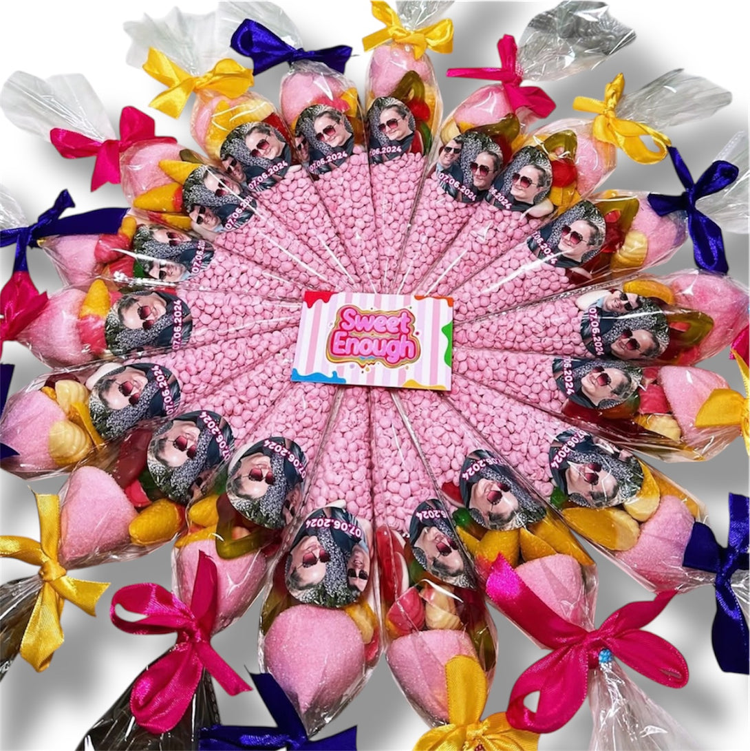 - PERSONALISED MESSAGE / IMAGE - If you would like to add a personal touch to your sweet cones, please use the notes section at checkout to type your message, and tell us about any particular image or theme you'd like on the stickers. If you want use your own picture, please email it to hello@sweetenoughuk.com